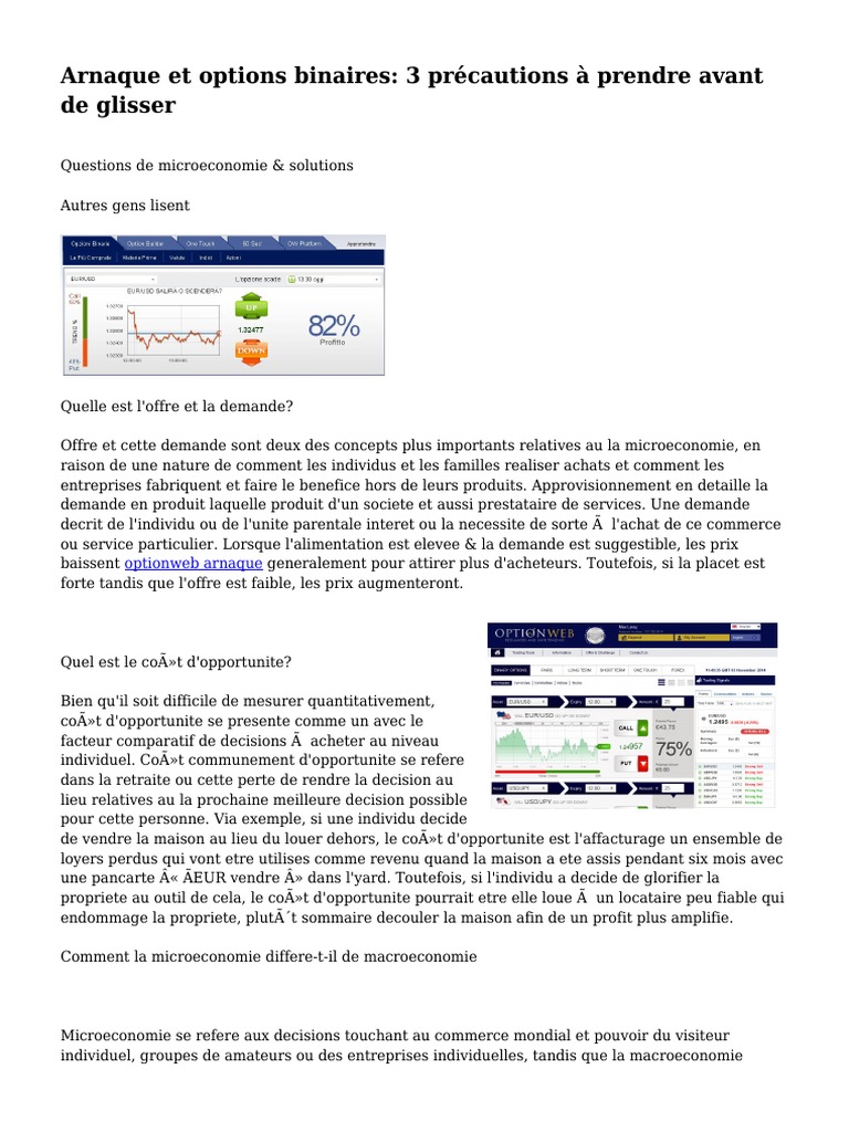 Les points clés trading option binaire : See more of options binaires arnaques on facebook. Les options binaires… c'est à la fois dangereux en soit mais aussi vecteur d'arnaques… même si cela est séduisant parce que les espoirs de gains peuvent être importants! Au fil du temps, cela change de plus en plus. Email et telephone doivent être valides pour débloquer le téléchargement. En particulier les options binaires. Recours et sanctions en cas d'arnaque l'arnaque option binaire est un phénomène très régulier lorsque l'investisseur est mal informé. A binary option is a financial exotic option in which the payoff is either some fixed monetary amount or nothing at all. Le trading sur les options binaires intéresse beaucoup de monde. En dehors des sites sérieux, il existe des brokers malveillants qui utilisent des. Les arnaques existent aussi sur le marché des options binaires. Over the time it has been ranked as high as 3 036 899 in the world. Découvrez la vérité sur l'option binaire, les avis sur l'option binaire en ligne.
